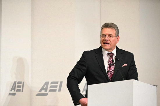 2月19日,歐盟委員會負責貿易和經濟安全等事務的委員馬羅什·謝夫喬維奇在美國首都華盛頓發表講話。新華社/法新