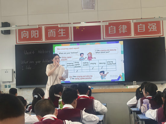 課堂伊始,李雪播放了一首歡快的英文歌曲My Hobbies。學生們隨著節奏律動,在輕松愉悅的氛圍中迅速融入學習狀態。接著,她借助Magic Fingers活動,復習了已學短語并自然地導入新課。學生們通過觀察李老師展示的各類愛好圖片,踴躍開口嘗試表達:“She likes dancing?”“He likes playing football?”課堂氛圍熱烈,活力四射。