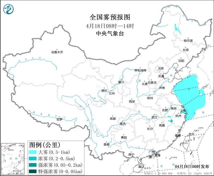 預計,4月18日白天至夜間,黃海中部和南部海域、東海北部海域、長江口及杭州灣附近海域、舟山群島附近海域、青島港、上海港、寧波港將有大霧;此外,4月18日早晨至上午,安徽南部、江西東部、浙江西部、黑龍江西部、內蒙古東北部等地的部分地區有能見度不足1公里的大霧,局地有能見度不足500米的濃霧。