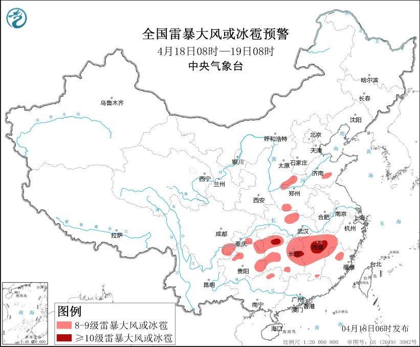 預計4月18日08時至19日08時,西南地區東部、江漢、江南以及河南西北部、山東南部等地的部分地區將有8級以上雷暴大風或冰雹天氣,其中,湖南中部和西北部、江西中北部等地的部分地區將有10級以上雷暴大風,最大風力可達11級以上;西南地區東部、江南等地的部分地區將有小時雨量大于20毫米的短時強降水天氣,其中,湖南中北部、江西中北部、貴州東南部等地的部分地區小時雨量大于50毫米,最大可達60毫米以上。