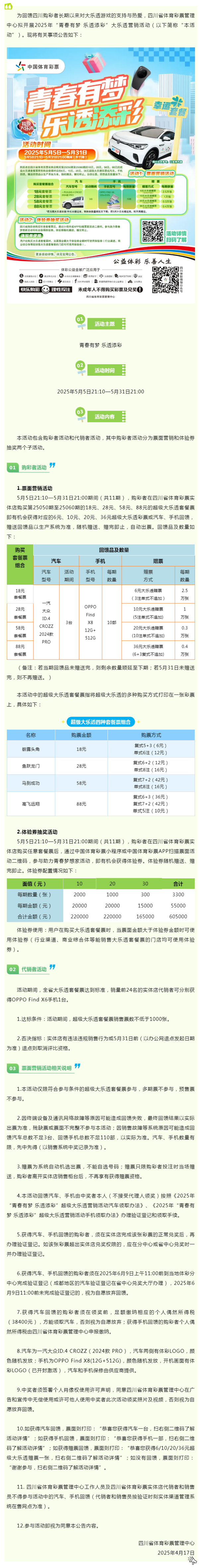 【公告】四川省體育彩票管理中心關于開展2025年“青春有夢 樂透添彩”大樂透營銷活動的公告