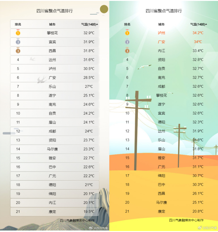 4月21日14時,四川共有攀枝花、宜賓、涼山、達州、瀘州5個城市的氣溫超過30℃,而昨天同一時刻,全省除甘孜、阿壩、涼山三州外,其余城市氣溫均超過30℃。