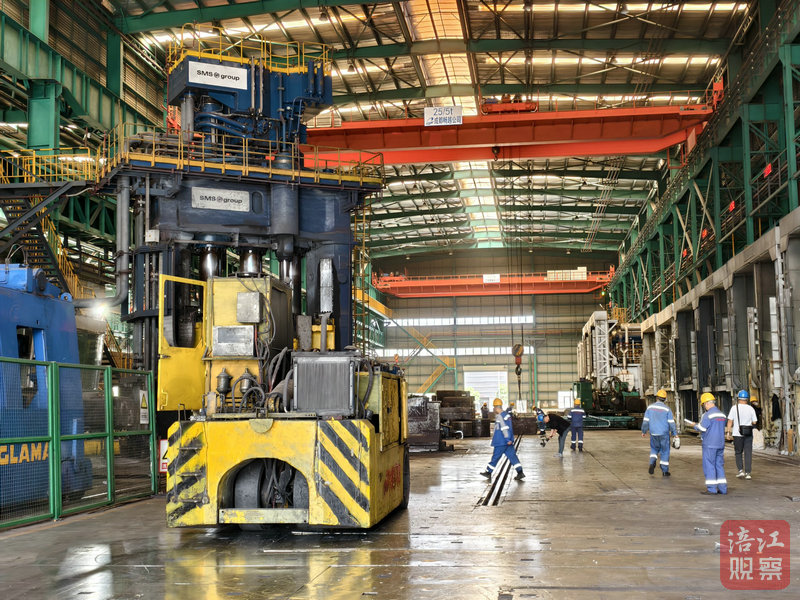 “百煉”之后是“千錘”。記者在六合特材鍛造車間看到,國內最先進的自由鍛設備正在將重達數噸的坯料鍛壓變形。據了解,此快鍛機最大鍛造壓力可以達到6000噸,最大鍛造頻次達到每分鐘115次,裝備的雙操作車可以按照工藝需要進行高難鍛造動作配合。鍛造可以使高品質特種金屬材料內部組織更加均勻,以滿足材料耐高溫耐腐蝕嚴苛的使用要求。