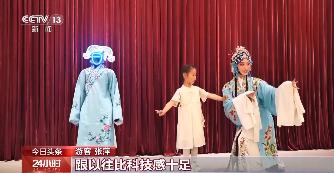 “五一”假期,江蘇鹽城建湖九龍口淮劇小鎮化身科技戲臺,機器人演員與梨園名家同臺獻藝、默契共舞。