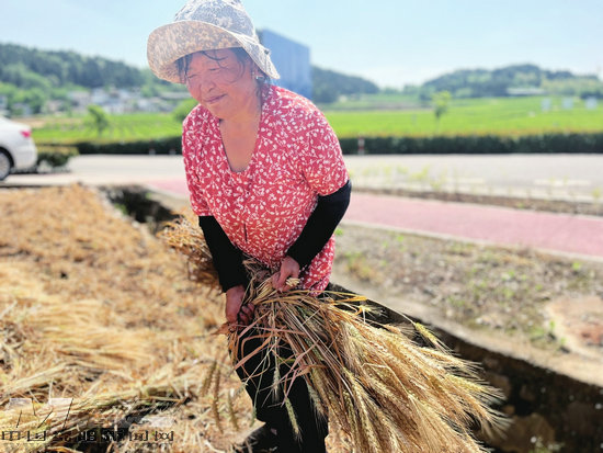 農(nóng)戶沈清林在運(yùn)糧車旁,興奮地捧起一把麥粒向記者展示:“你看,這麥子長得多好,顆粒大而飽滿。之前還擔(dān)心收成,現(xiàn)在看來,產(chǎn)量非??捎^。”他有3畝多小麥地,一大早就聯(lián)系了收割機(jī),不到兩個小時,小麥就收割完了,“機(jī)器收割很快很方便,趁著這兩天天氣好,我們好把麥子曬干。”沈清林說。
