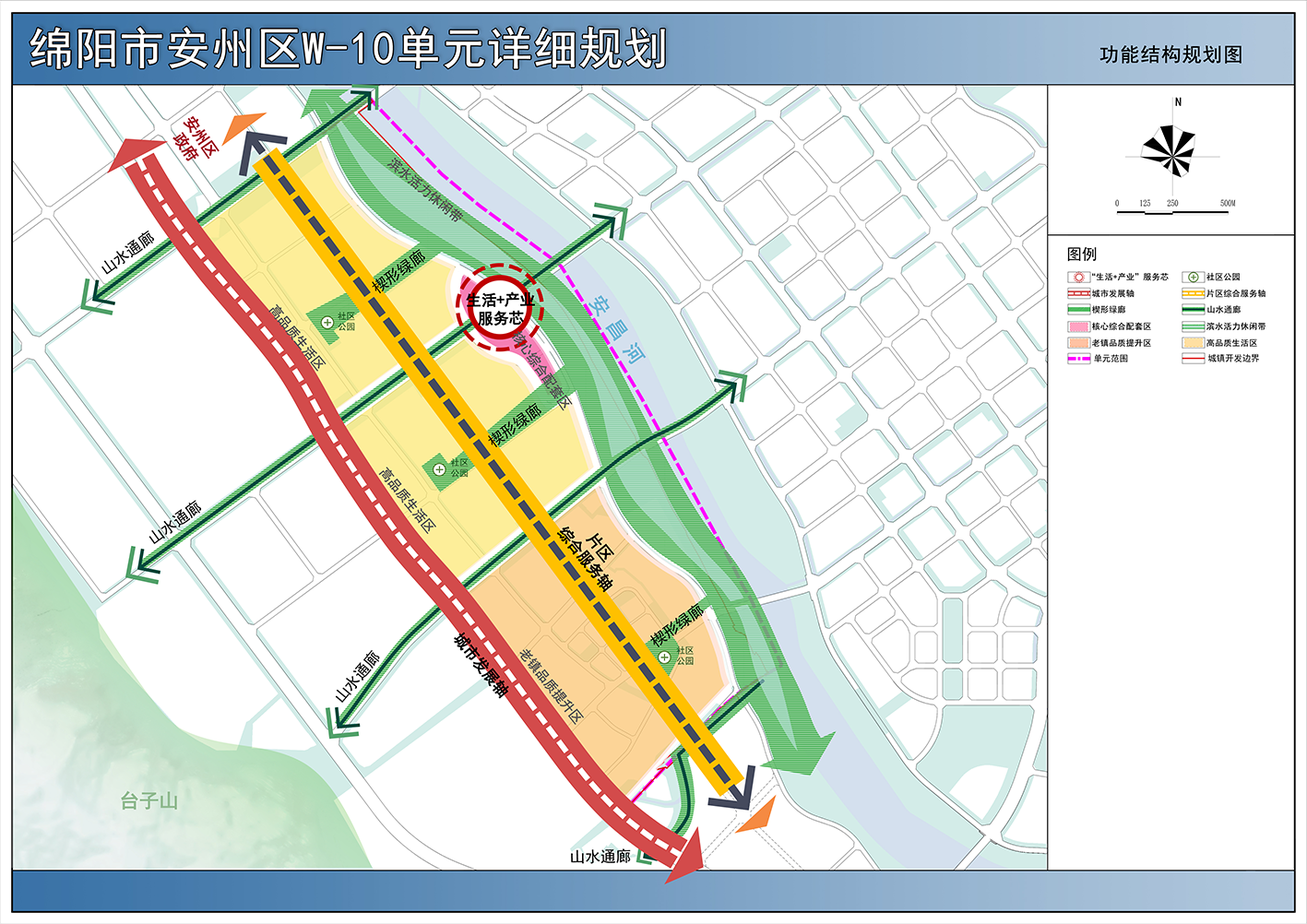規劃形成“兩軸一芯,一帶七廊三區”的功能結構。