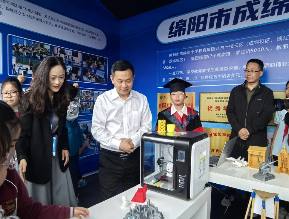 學生作品展示區,各類成果更是亮點頻出。科技小發明、小制作,一件件創意十足的作品,充分彰顯了成小學子卓越的動手能力和創新思維;科技繪畫作品展示區,一幅幅畫作主題豐富多樣,從神秘莫測的太空探索,到充滿無限可能的未來城市,無不展現著學生們對未來科技的奇思妙想。展區的3D打印體驗活動吸引了同學們的極大興趣。他們聚精會神地觀看3D打印機將數字模型轉化為實體,模型成型時,同學們表現出濃厚的好奇心和喜悅,爭相觸摸并贊嘆科技的神奇。