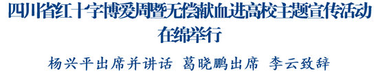 綿陽新聞網訊 5月7日,在第78個“世界紅十字日”來臨之際,由省紅十字會、省衛生健康委、省教育廳、團省委聯合主辦的四川省紅十字博愛周暨無償獻血進高校主題宣傳活動在綿舉行。副省長、省紅十字會會長楊興平出席講話并看望慰問無償獻血師生,省政府副秘書長葛曉鵬出席,市委副書記、市長李云致辭。
