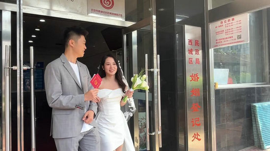 5月10日,在北京市西城區(qū)婚姻登記處,一對(duì)辦理完結(jié)婚登記的新人走出大門(視頻截圖)。新華社記者 龐元元 攝