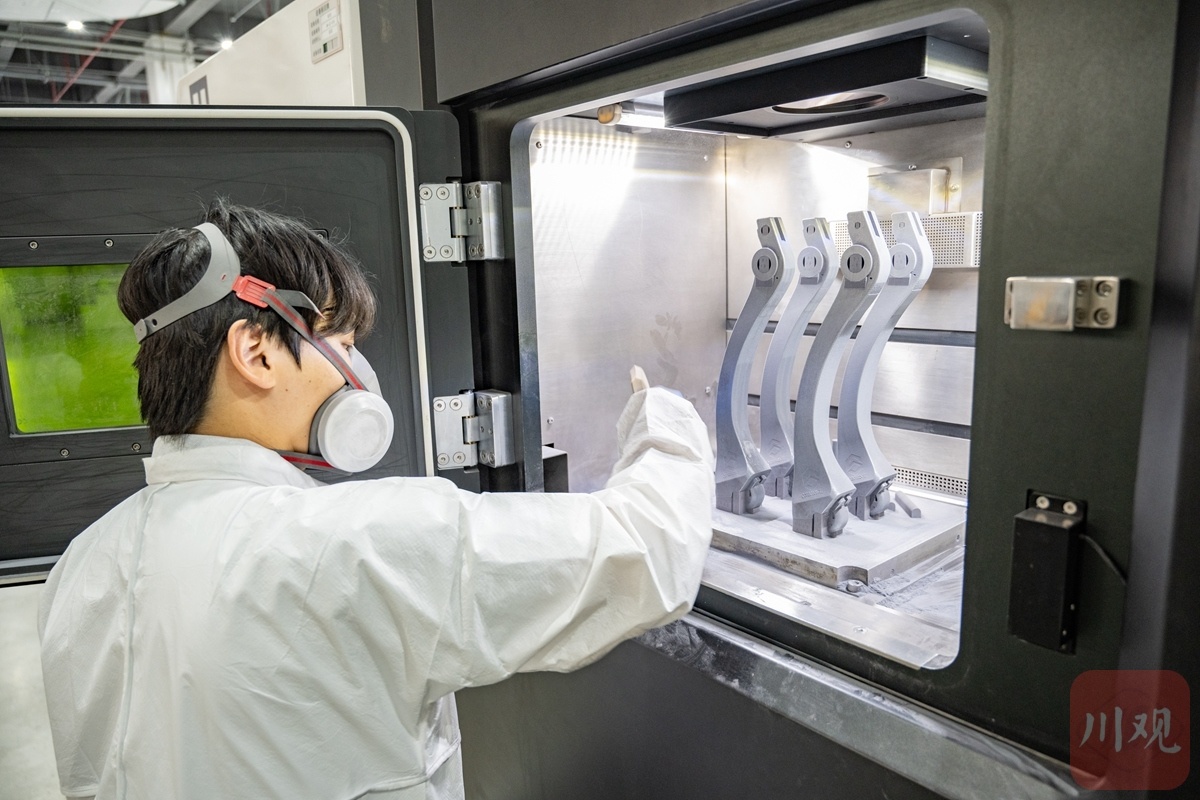 四川五八增材科技有限公司內,工作人員操作“金屬3D打印機”,正在“打印”機器狗的下肢。攝影/趙明