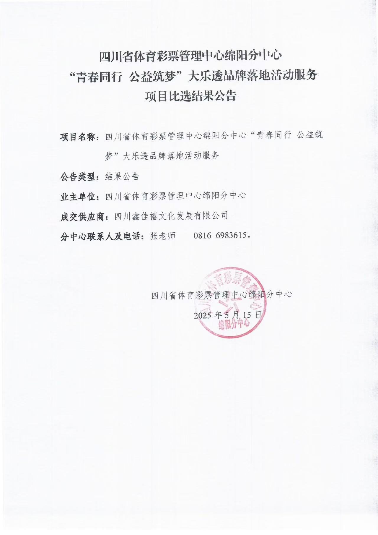 四川省體育彩票管理中心綿陽(yáng)分中心“青春同行 公益筑夢(mèng)”大樂(lè)透品牌落地活動(dòng)服務(wù)項(xiàng)目比選結(jié)果公告