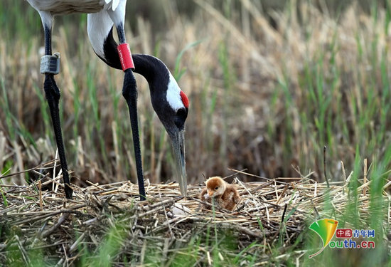 2025年5月14日,黑龍江扎龍國家級自然保護(hù)區(qū),丹頂鶴哺育幼鳥。自今年3月13日,黑龍江扎龍國家級自然保護(hù)區(qū)散養(yǎng)的丹頂鶴產(chǎn)下了今春的第一枚卵,保護(hù)區(qū)新一輪繁殖期在濕地上拉開序幕。從1984年開始,扎龍保護(hù)區(qū)實現(xiàn)丹頂鶴散養(yǎng)野外越冬,逐步建立散養(yǎng)鶴群體,經(jīng)過40多年的經(jīng)驗積累逐步總結(jié)出了“親代放歸→中間種群(散養(yǎng)鶴種群)→子代野化”的野化方式,目前通過衛(wèi)星追蹤器(GPS)和環(huán)志佩戴方式成功監(jiān)測到遷徙數(shù)據(jù)25條,保護(hù)區(qū)繁育中心周邊穩(wěn)定的散養(yǎng)繁殖對維持在12——15對對左右。2025年截至目前,已觀察到15對散養(yǎng)丹頂鶴繁殖對筑巢產(chǎn)卵,孵化雛鳥24只,成活了14只左右。