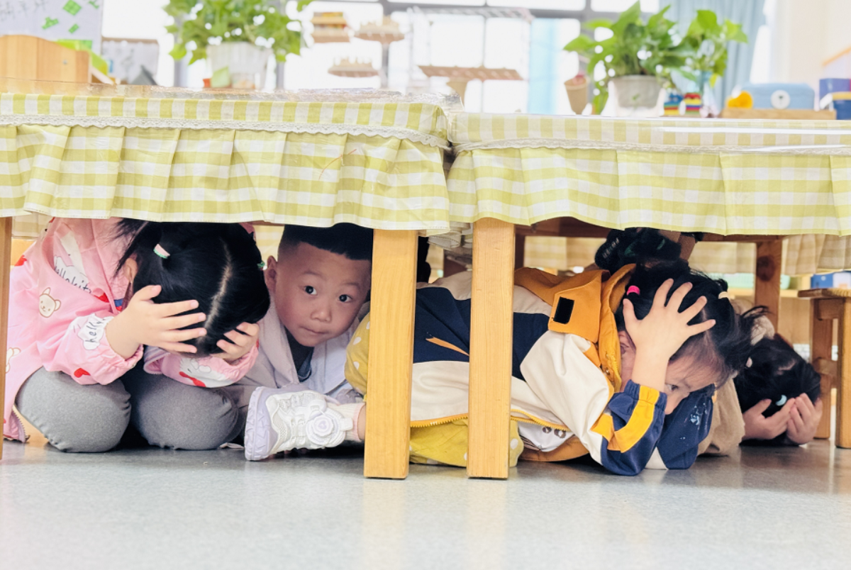 地震預(yù)警警報(bào)響起,立即進(jìn)入緊急避險(xiǎn)狀態(tài)。“地震啦!大家快躲到安全區(qū)域!”孩子們?cè)诶蠋煹闹笇?dǎo)下迅速抱頭、蜷曲身體,躲到桌子底下或墻角三角安全區(qū)域。 警報(bào)停止后,各班老師迅速組織幼兒雙手護(hù)頭,彎腰,按照逃生路線快速有序地緊急撤離到幼兒園操場(chǎng)上。在撤離過(guò)程中老師們確保每位幼兒的安全,防止發(fā)生踩踏事故。抵達(dá)安全地帶后,各班老師第一時(shí)間清點(diǎn)人數(shù),確認(rèn)無(wú)人員遺漏,并及時(shí)向總指揮員報(bào)告,整個(gè)匯報(bào)過(guò)程快速、準(zhǔn)確、高效。