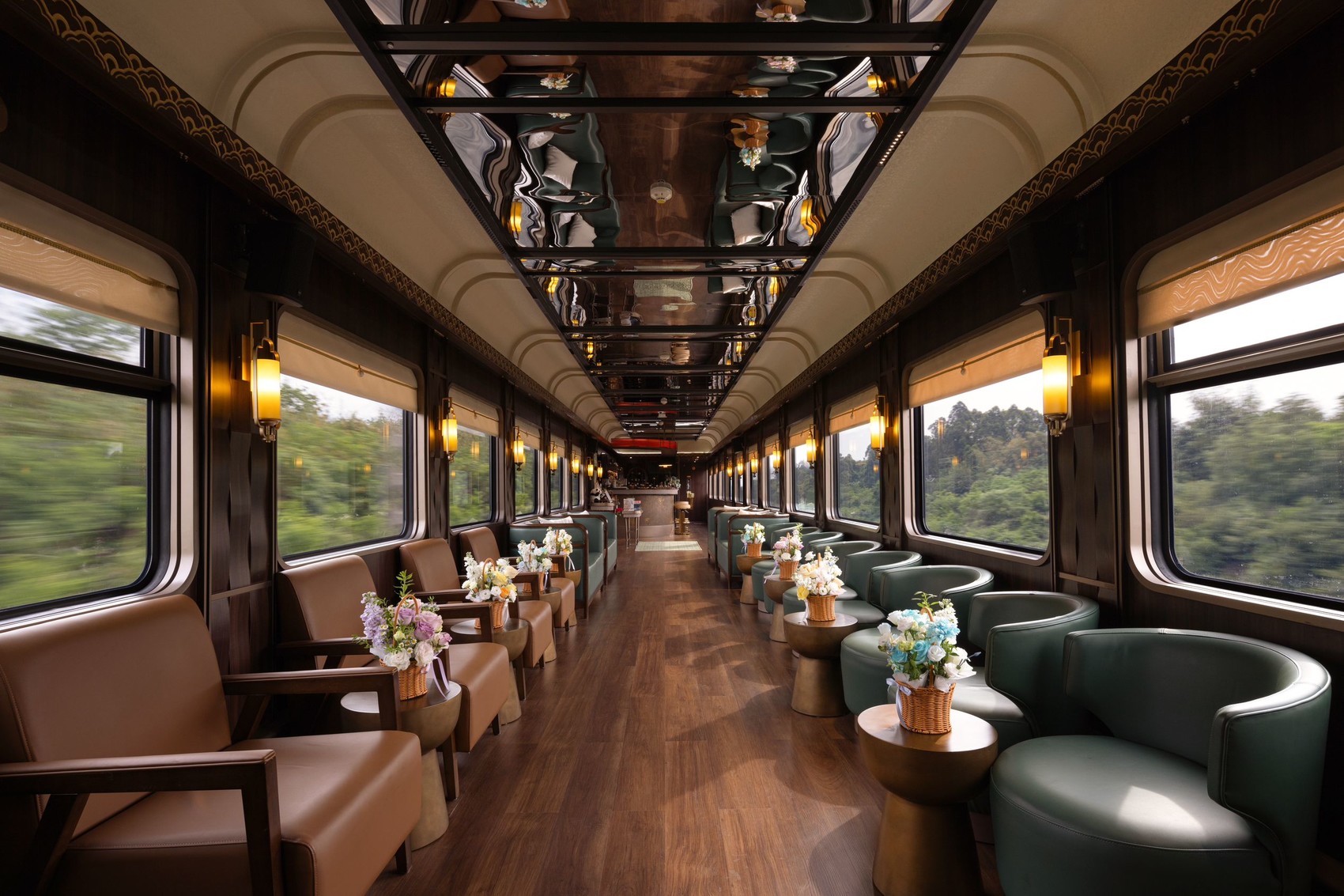 記者現場看到,“熊貓專列·成都號”由綠皮車改造而成,配備54個包房,含標間和大床房。每個包房內配有干濕分離衛浴、智能語音控制系統,連窗戶都比普通列車寬30厘米;公共區域配有餐廳、KTV、酒吧、茶室、麻將桌、按摩椅、兒童游戲區等,如同一艘軌道上的豪華游輪。