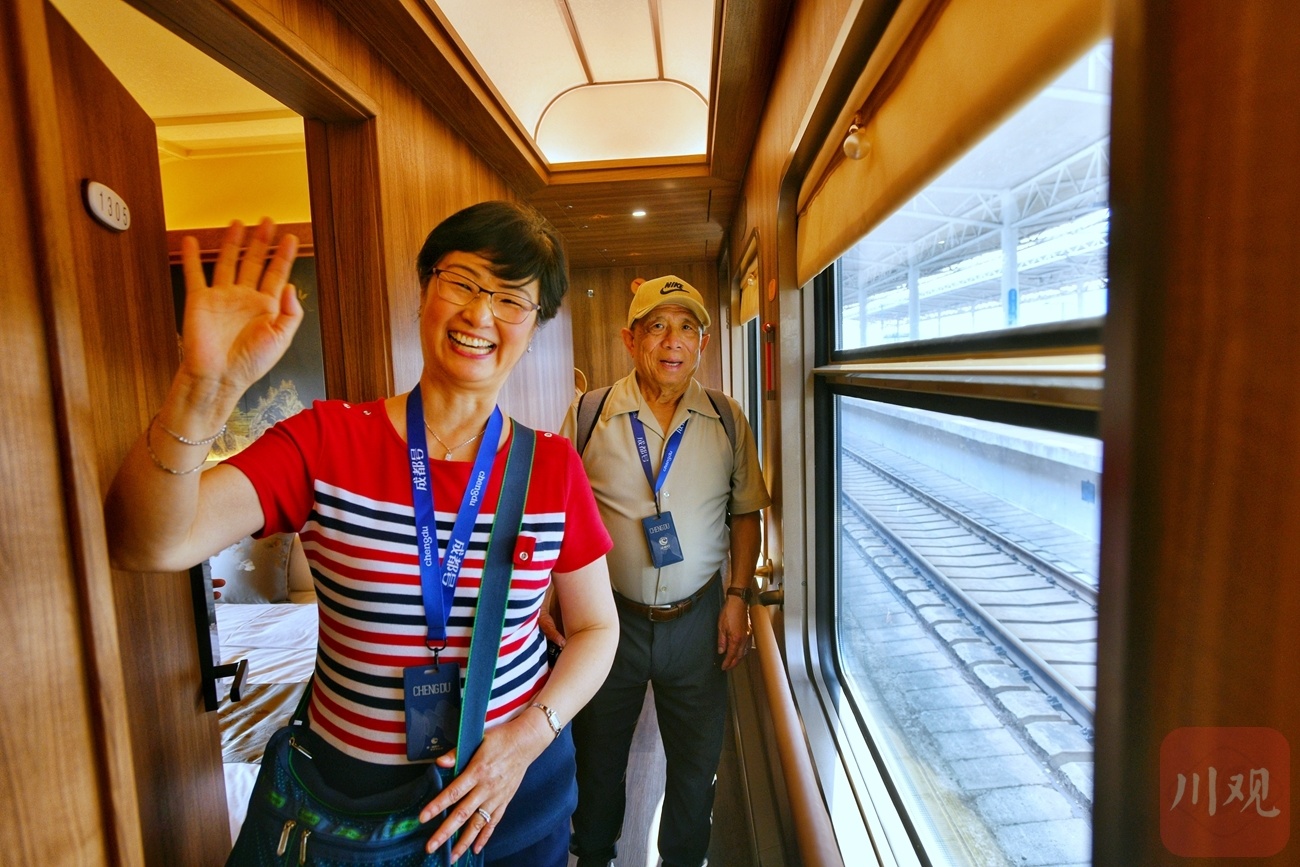 “成都號”旅客約首發游客共109人,主要來自美國、加拿大、日本、菲律賓等國家以及我國北京、上海、福建、四川、香港、臺灣等地,其中境外游客65人,占比59.6%;50歲以上乘客占比達到80%。既是“國際范”專列,也是“銀發”專列。從此前預售情況來看,今年10個團期中,境外游客約占70%,中老年游客占比也較高。