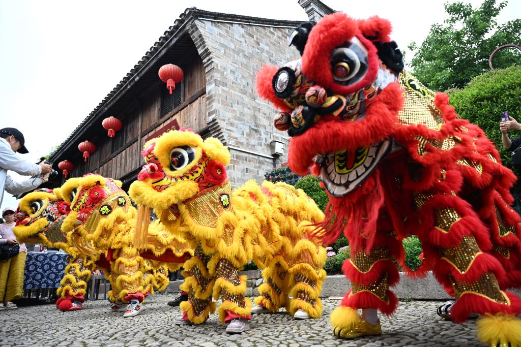 5月19日,在浙江省寧波市寧海縣前童古鎮(zhèn),少年舞獅隊向游客展示當(dāng)?shù)靥厣奈瑾{表演。新華社記者劉銘翔 攝