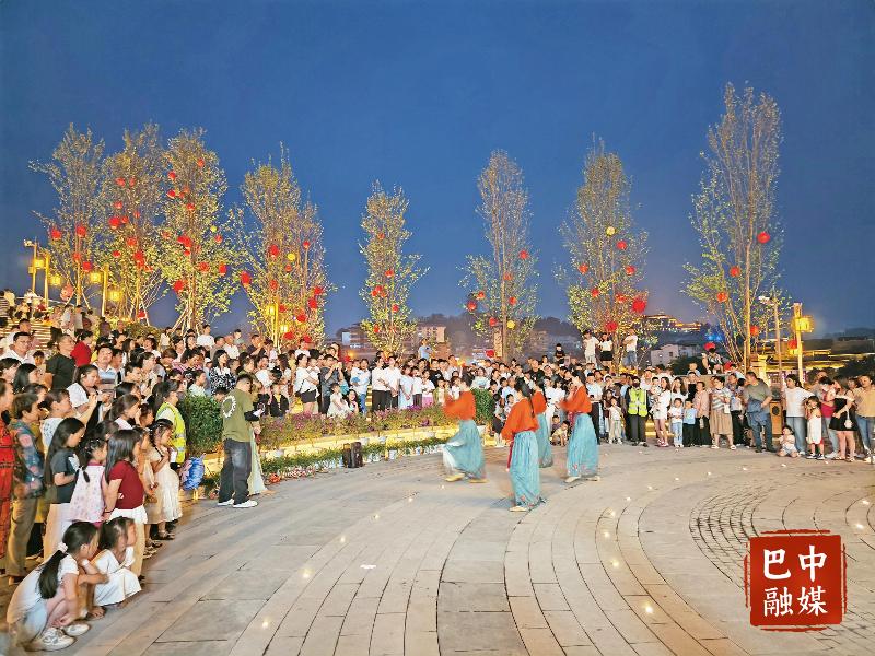 隔著粼粼波光,“恩陽夢華錄”宛如一座燈火輝煌的不夜城。在夢華錄廣場上,身姿曼妙的舞者身著華服,隨著悠揚婉轉的古樂翩翩起舞,街道兩側,民俗藝人展示糖畫、棕編等傳統技藝,舉著宮燈的巡游隊伍緩緩穿行,游客們身著古裝穿梭其中,仿佛將眾人帶回了繁華熱鬧的古代市集。