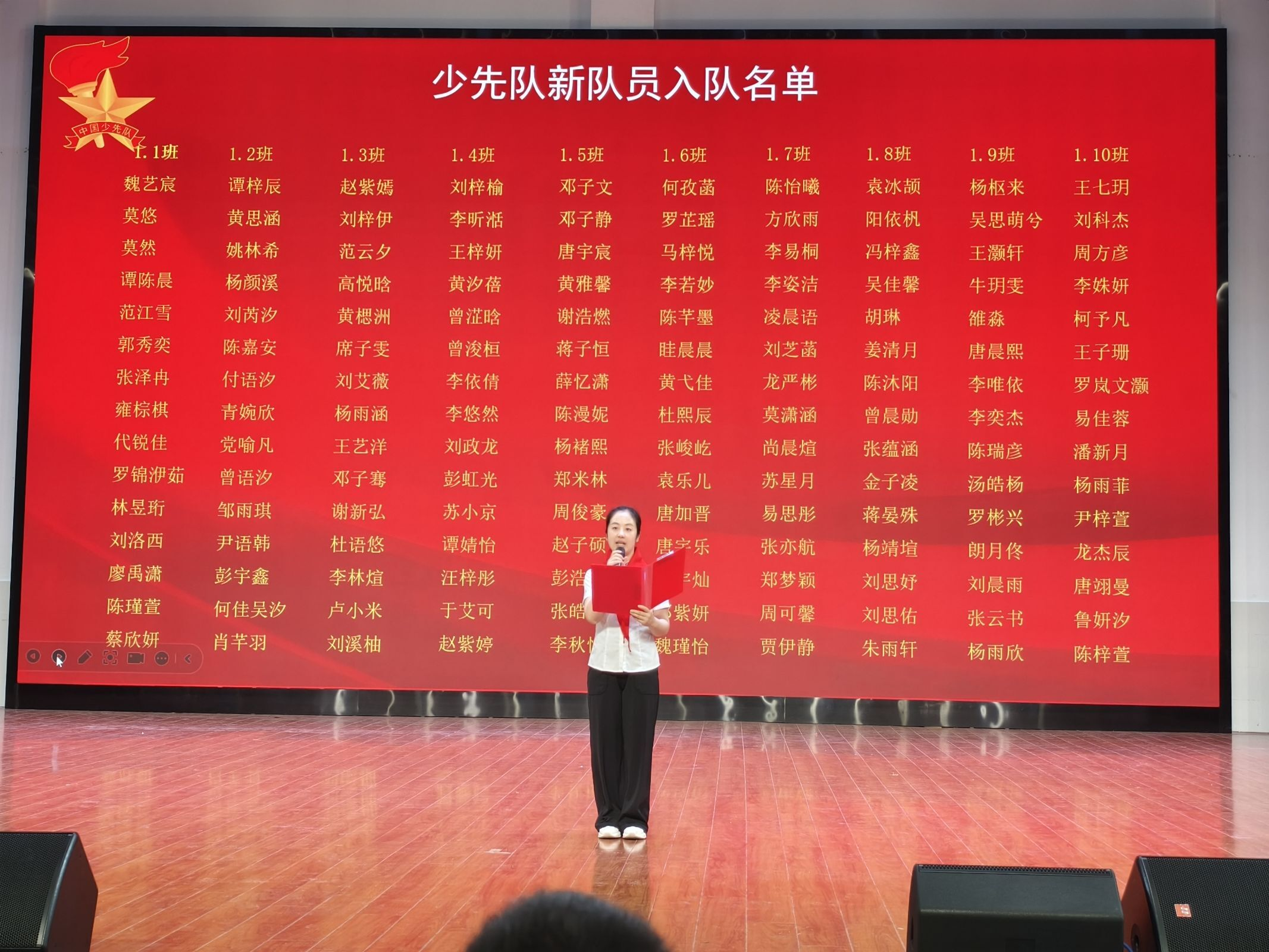 上午9時,儀式在激昂的《出旗曲》中拉開序幕。全體師生肅立敬禮,高唱《中國少年先鋒隊隊歌》,嘹亮的歌聲響徹校園。副校長劉德旭宣讀了組建一年級少先隊組織的決定,宣布成立一年級聯合中隊,下設10個新中隊。隨后,德育副主任梁盈鄭重宣讀了新隊員名單,魏藝宸、譚梓辰、趙紫嫣等278名同學自豪地佩戴上鮮艷的紅領巾,在大隊長龔芯可兒的帶領下莊嚴宣誓:“準備著,為共產主義事業貢獻力量!”鏗鏘誓言中,新隊員目光堅定,展現了新時代少先隊員的昂揚風貌。
