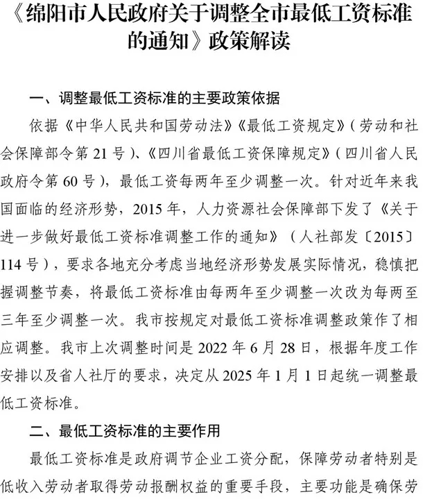 《綿陽市人民政府關于調整全市最低工資標準的通知》