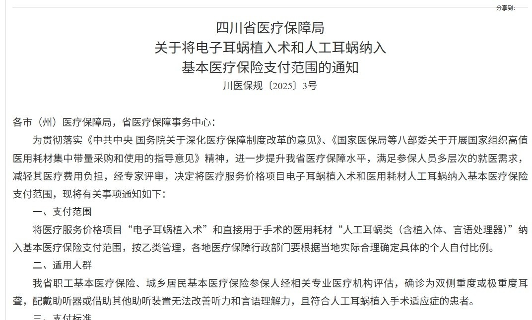 6月1日起, 四川省醫療保障局正式將電子耳蝸植入術及人工耳蝸納入基本醫療保險支付范圍。全省職工基本醫療保險、城鄉居民基本醫療保險參保人,經確診為雙側重度或極重度耳聾,且在佩戴助聽器等常規助聽方式無效,同時符合人工耳蝸植入手術適應癥的患者,都能享受這一政策紅利。