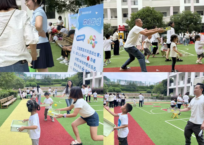 你扔我接:三組家庭同時進行比拼,小朋友們化身“投球手”,用力將小球投向后面2米處手持小筐的家長,家長們則變身“接球手”,眼疾手快地移動小筐,努力接住更多飛來的小球。此起彼伏的加油聲和接到球的歡呼聲匯成一片歡樂的海洋,接球最多的家庭贏得了象征勝利的小玩具。
