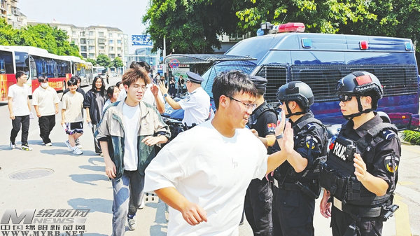 進考場前,考生與執勤民警擊掌,加油鼓勁。記者陳元松攝