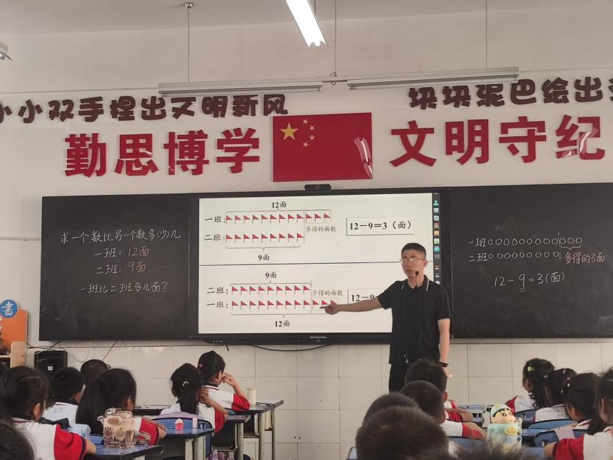 該校楊起帆老師在一年級(jí)(5)班執(zhí)教《求一個(gè)數(shù)比另一個(gè)數(shù)多(少)多少》校級(jí)名師示范課。本節(jié)課以“紅旗評(píng)比”生活情境切入,學(xué)生在畫(huà)圖探究的實(shí)踐操作中,經(jīng)歷“發(fā)現(xiàn)問(wèn)題—畫(huà)圖建模—對(duì)比分析”的完整探究過(guò)程。教師通過(guò)動(dòng)態(tài)呈現(xiàn)學(xué)生手繪的差異對(duì)比圖,引導(dǎo)他們自主發(fā)現(xiàn)“求差問(wèn)題”中部分與整體的關(guān)系,將抽象的“多幾少幾”轉(zhuǎn)化為直觀的圖示語(yǔ)言。