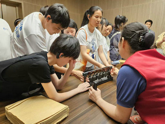 6月19日,第四屆視障讀者“光明閱讀”邀請賽決賽選手在湖北省博物館觸摸編鐘微縮模型。(許筠攝)