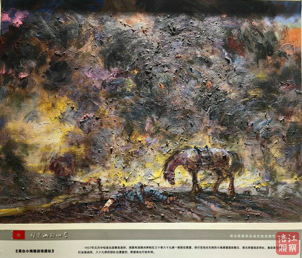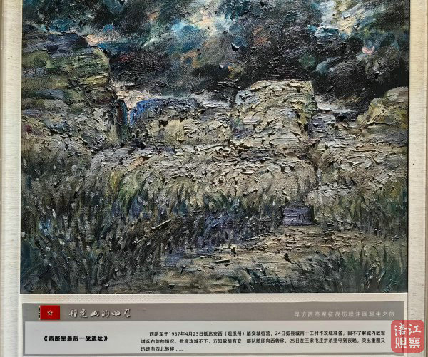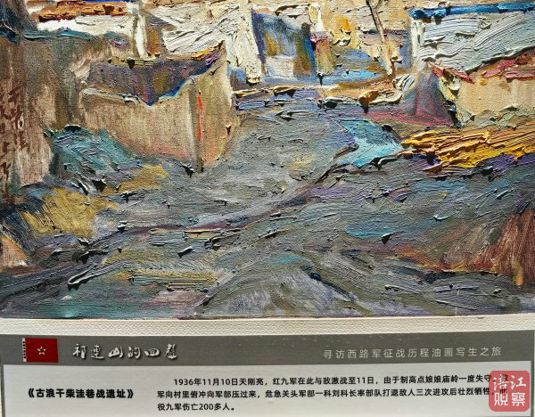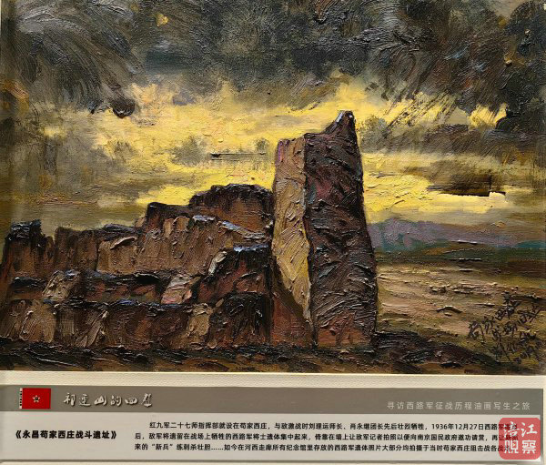 繪畫《石窩會議遺址》講述了1937年紅軍西路軍歷經數月苦戰,被迫轉移祁連山石窩鄉,在3月14日傍晚召開“石窩會議”的歷史記憶;《永昌八壩狙擊戰遺址》再現的是1936年11月25日至28日,西路軍在永昌境內取得唯一一次重大勝利的歷史;《西路軍最后一戰遺址》再現的是,西路紅軍于1937年4月突出重圍向西北轉移的歷史……