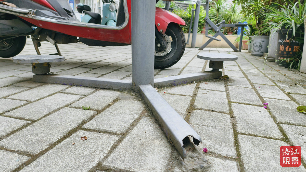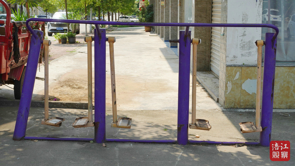涪城區瓦店社區文化廣場的三位扭腰器、太空漫步機安裝于2015年10月,經歷十年風雨后,金屬部件銹跡斑斑,部分焊接點斷裂。