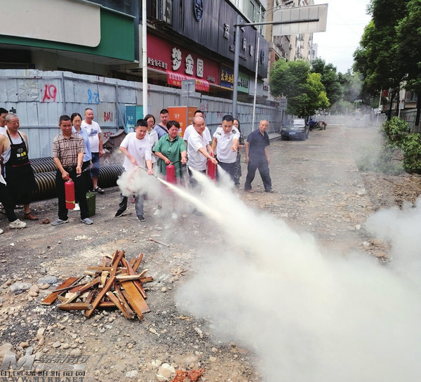 社區(qū)居民學(xué)習(xí)滅火器使用。