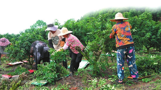 采收現場,工人爭分奪秒,動作嫻熟。他們頭戴遮陽帽,左手戴著厚實的手套,右手持電動剪刀,在花椒樹間穿梭忙碌。電動剪刀發出“咔嚓咔嚓”的聲響,一簇簇青花椒精準地剪下,被整齊碼放在旁邊袋子上,等待轉運。村民楊小林告訴記者,他們采收花椒是帶枝采收,采收后要對樹進行定型,定型的目的是為了讓它更好地發芽,為明年的花椒豐收做準備。