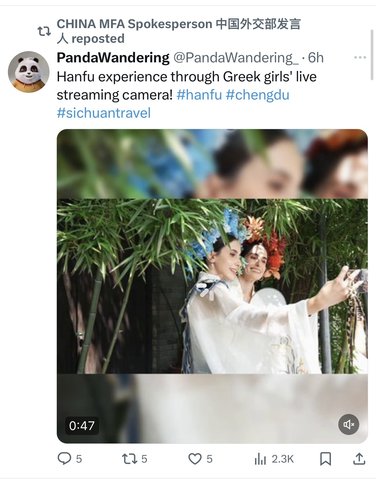 記者梳理發(fā)現(xiàn),這兩次轉(zhuǎn)發(fā)分別對(duì)應(yīng)兩場活動(dòng):一次是轉(zhuǎn)發(fā)中國駐希臘大使方遒發(fā)布的“成都至雅典航線開通儀式”現(xiàn)場圖文,另一次則聚焦“中希網(wǎng)紅游名城”活動(dòng)——希臘網(wǎng)絡(luò)達(dá)人走進(jìn)成都寬窄巷子體驗(yàn)慢生活的畫面。
