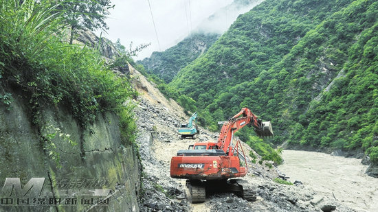 禹茂路K2597+400(石泉堡隧道出口)發生山體崩塌和路基垮塌,導致該路段交通完全中斷。災情發生后,搶通戰役迅速打響,大型機械設備兵分兩路,從禹里、壩底兩個方向同時向災害點推進,開展攻堅作業,全力搶修臨時應急便道。為確保安全,相關部門立即實施交通管制,由黨員志愿者、公安交警值守引導。