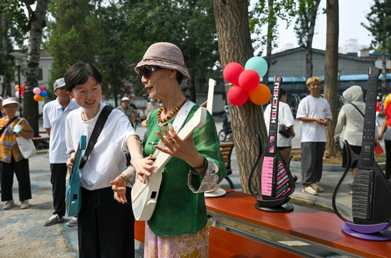 7月11日,老年人嘗試演奏“賽博吉他”。“賽博吉他”通過實現傳統吉他的數字化革新,降低了學習門檻。