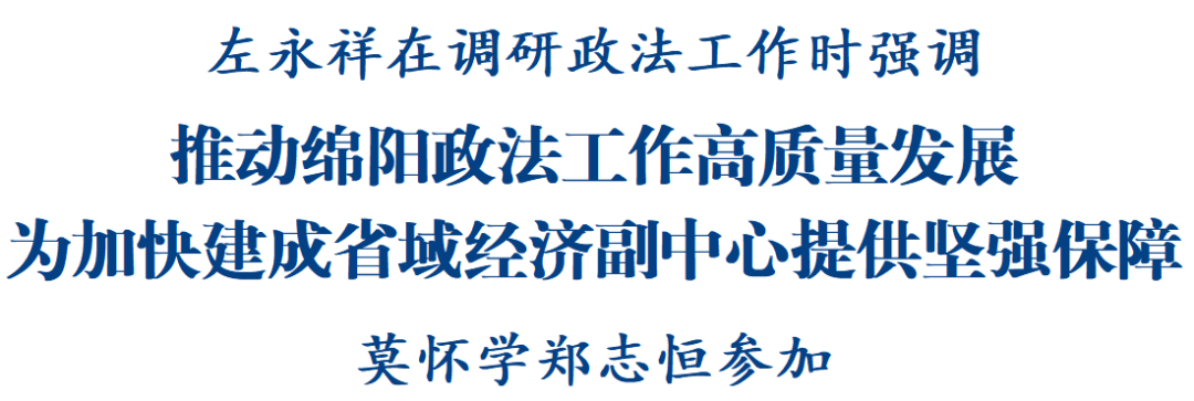 調研過程中,左永祥強調,當前全市上下正朝著譜寫中國式現代化綿陽新篇章奮勇前行,推進現代化建設、推動高質量發展需要堅強有力的法治保障。全市政法系統要聚焦全市中心大局,找準工作的切入點、著力點,把為加快建成省域經濟副中心提供堅強有力法治保障貫穿始終,積極進取、擔當作為,努力為服務全市經濟社會發展作出更大貢獻。要堅持和發展好新時代“楓橋經驗”,增強工作的預見性、主動性,不斷完善社會矛盾糾紛源頭預防、排查預警、多元化解工作機制,深入開展“大調研、大培訓、大提能”活動,防范化解重大安全風險,努力建設更高水平的平安綿陽、法治綿陽。要發揮好法治固根本、穩預期、利長遠的保障作用,在營造法治化營商環境、平等保護各類經營主體、維護消費者合法權益、服務高水平對外開放等方面下更大功夫,更好助力綿陽高質量發展。要始終堅持黨對政法工作的絕對領導,加強政法隊伍政治、作風、能力建設,扎實開展深入貫徹中央八項規定精神學習教育,以鐵的紀律鍛造忠誠干凈擔當的新時代政法鐵軍。