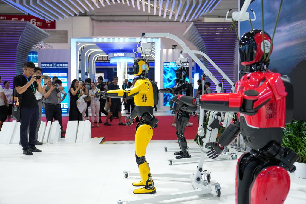 7月17日,在第三屆鏈博會數字科技鏈展區,參觀者觀看人形機器人表演。新華社記者 鞠煥宗 攝
