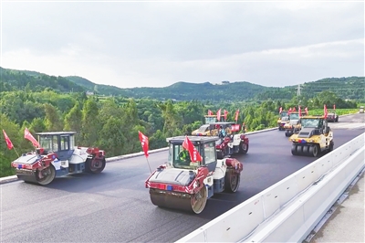 7月25日,記者走進廣綿擴容梓潼段施工現場看到,隨著攤鋪機履帶的快速轉動,原本粗糙的路基被迅速覆蓋上一層平整的瀝青。緊隨其后的壓路機來回碾壓,將松散的瀝青層壓實平整,輪跡所過之處,路面變得光滑而堅實。