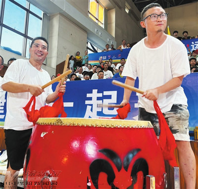 比賽開始后,伴隨鏗鏘有力的音樂旋律,兩隊球員縱橫馳騁、你追我趕,比分交替上升。每一次精彩的攻防轉換都激發歡樂的高潮:加油的戰鼓聲震耳發聵,“魔丸必勝!”“安州雄起!”的聲聲吶喊在球館里回蕩。第二節賽時結束,“魔丸隊”與“安der逸”比分為34∶25。