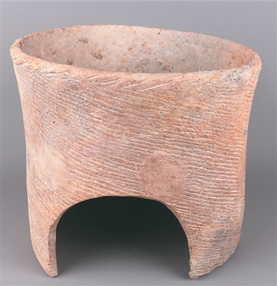 一尊設計精巧的陶灶吸引了觀眾的目光。陶灶呈鼓形,一側有近半圓形的灶門,外壁飾粗繩紋,內部等距分布有7個長約7厘米的支丁,用于支撐炊具。4000多年前的寶墩先民就是用這樣的陶灶來烹煮食物,有人稱其為“成都平原第一灶”。