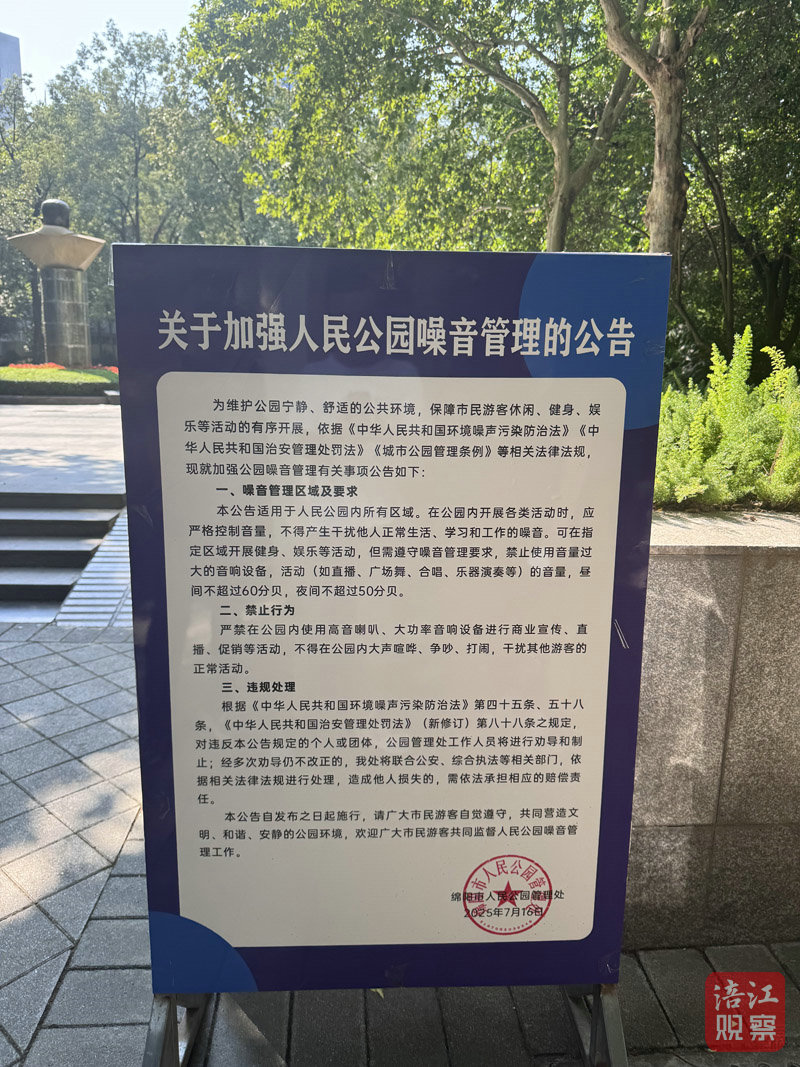 人民公園管理處相關負責人告訴記者,近期,公園已發布降噪公告,并與市公安特巡警在早晚高峰及節假日聯合行動,及時勸阻音量超標行為。