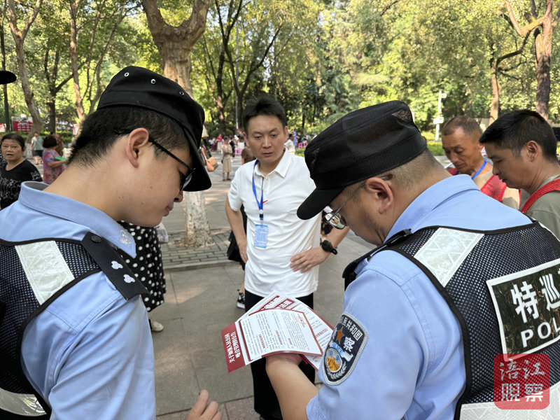 7月29日上午,記者在公園看到,特巡警與公園志愿者正在聯合勸導。在宣傳了噪音污染防治相關法規后,晨練樂隊很快調低了音量。