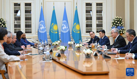 8月3日,聯合國秘書長古特雷斯(左三)和哈薩克斯坦總統托卡耶夫(右二)在哈薩克斯坦阿拉木圖舉行會談。新華社發(哈總統府供圖)