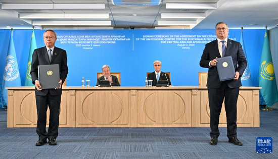 這是8月3日在哈薩克斯坦阿拉木圖拍攝的聯合國可持續發展目標中亞及阿富汗區域中心成立儀式。新華社發(哈總統府供圖)