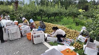 百畝梨園的工人正在分揀梨子