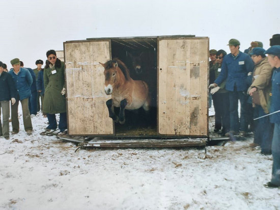 11匹普氏野馬遷入新疆野馬繁殖研究中心(1986年12月攝)。新疆卡拉麥里山有蹄類野生動物自然保護區管理中心提供