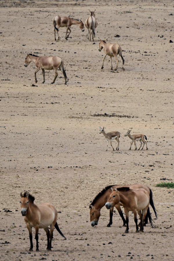 普氏野馬、鵝喉羚和蒙古野驢在新疆卡拉麥里山有蹄類野生動物自然保護區漫步。新華社記者 丁磊 攝