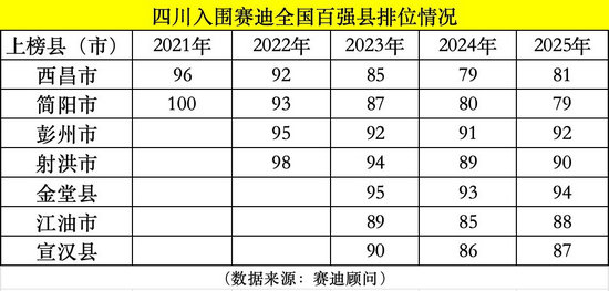 此外,四川上榜縣市區(qū)在百?gòu)?qiáng)“進(jìn)位賽”中也可圈可點(diǎn)。比如,成都市錦江區(qū)連續(xù)5年實(shí)現(xiàn)進(jìn)位,從2020年的第72位一路升至今年的第58位;德陽(yáng)市旌陽(yáng)區(qū)、成都市新都區(qū)也是連續(xù)3年保持進(jìn)位;簡(jiǎn)陽(yáng)市在賽迪全國(guó)百?gòu)?qiáng)縣排名連續(xù)4年實(shí)現(xiàn)進(jìn)位,攀升至第79位,成為四川省內(nèi)“首位縣”。