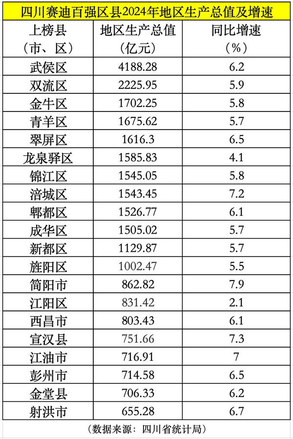 看到成績(jī)的同時(shí),也要正視四川縣域經(jīng)濟(jì)發(fā)展的短板。比對(duì)2025全國(guó)百?gòu)?qiáng)縣、百?gòu)?qiáng)區(qū)排行榜,從數(shù)量上看,江蘇入圍41個(gè),浙江28個(gè),四川20個(gè),雖在數(shù)量上躋身全國(guó)“第一梯隊(duì)”,但差距仍然明顯。從體量上看,全國(guó)62個(gè)千億縣,四川尚沒(méi)有縣(市)突破“千億”這一門檻;13個(gè)上榜百?gòu)?qiáng)區(qū)中,也僅成都市武侯區(qū)和雙流區(qū)GDP突破兩千億元,但,即使GDP突破4000億元的武侯區(qū),在全國(guó)看,也僅排在第15位,只能算第二梯隊(duì)。