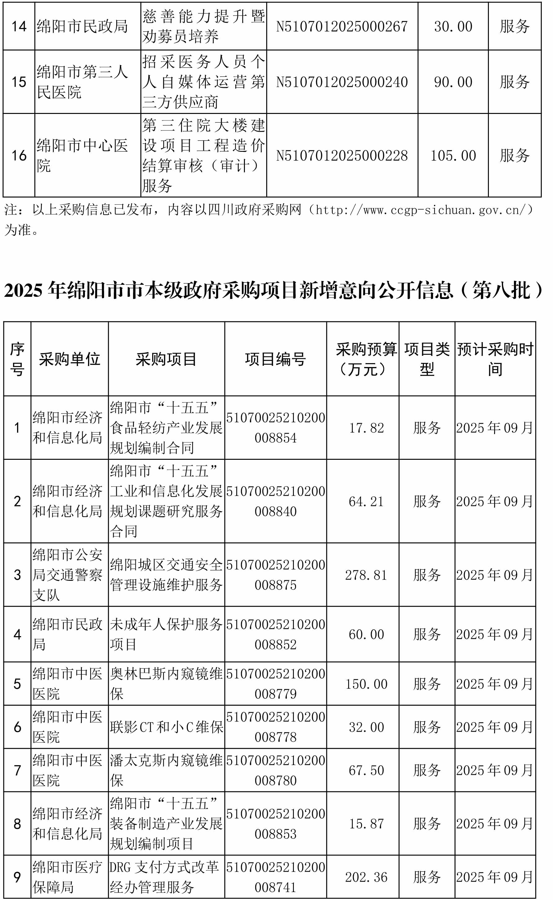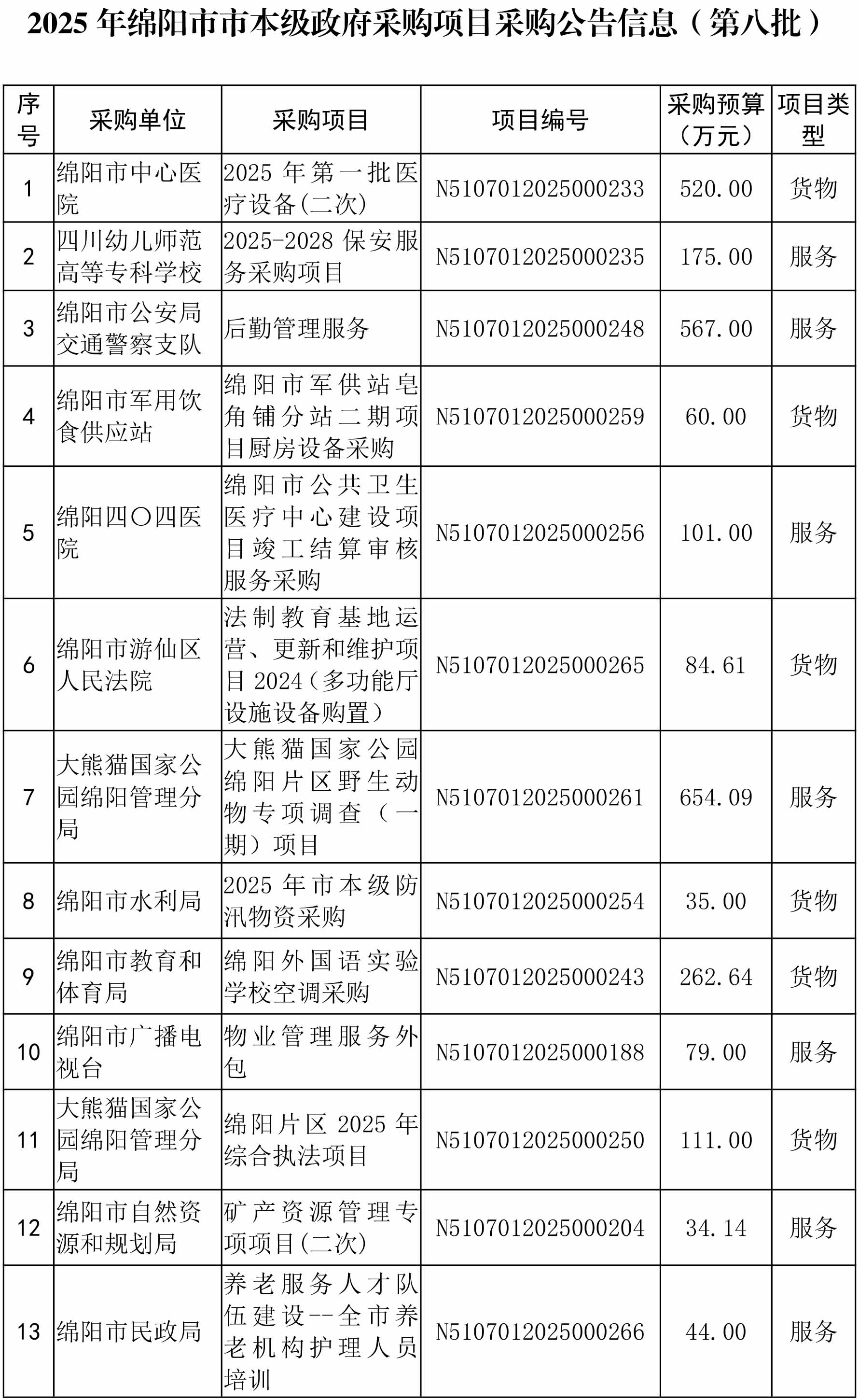 此批綿陽市市本級政府采購項目集中發布采購公告信息共計16個(于8月5日前已掛網),采購預算金額2952.48萬元,其中:貨物類項目6個,金額1073.25萬元;服務類項目10個,金額1879.23萬元。
